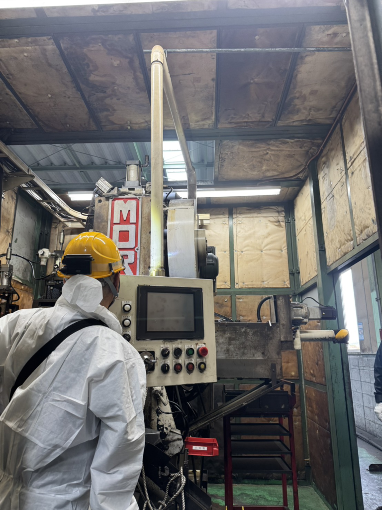 棒状の鉄を切断するプレス機が数台並んでいる工場です。